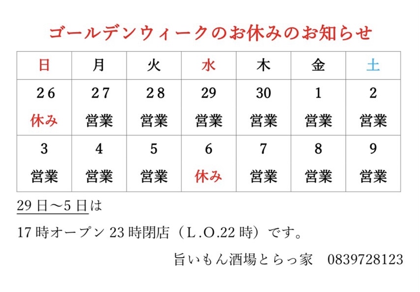 ゴールデンウィーク営業のお知らせ
