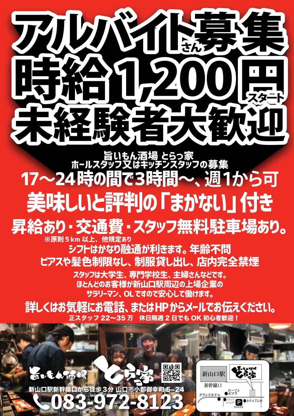 | 勤務地 | 旨いもん酒場 「とらっ家 」 〒754-0011 山口市小郡御幸町5−24 Y’sビル1階JR新山口駅新幹線口から徒歩3分 TEL 083-972-8123 居酒屋 「雷鶏 さんだぁばぁど」 〒755-0045 宇部市中央町1-2-19JR宇部新川駅から徒歩5分 TEL 0836-38-8848 |